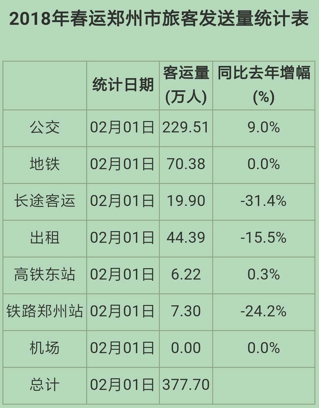 春运第一天各类交通运输方式的客运量数据新鲜出炉,其中公交、高铁站客运量比去年同期同比增长。